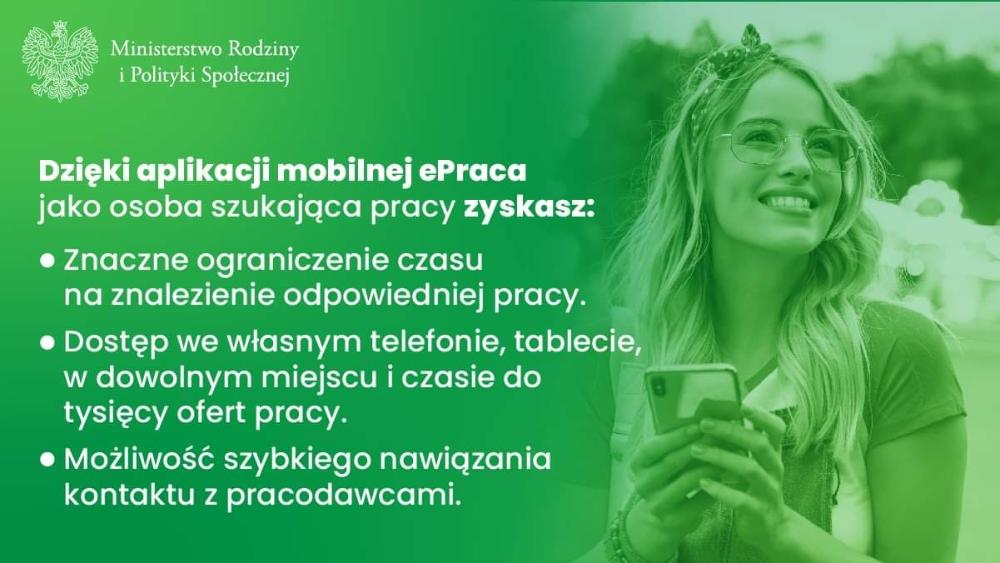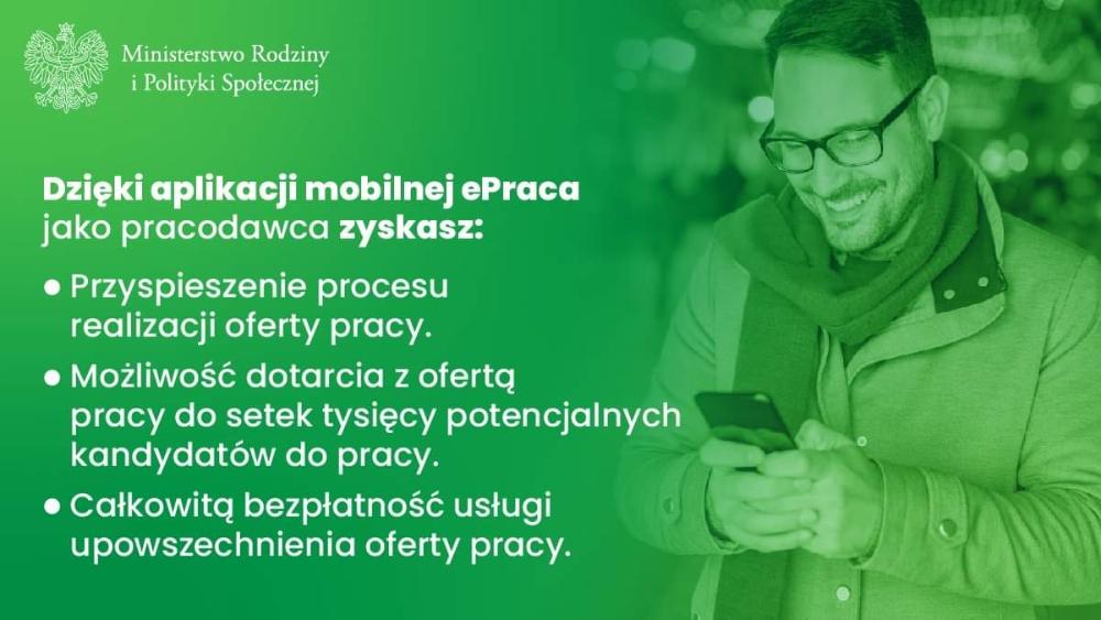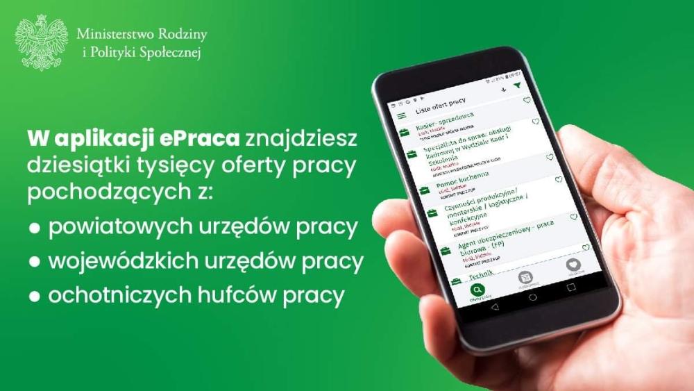 Ministerstwo Rodziny i Polityki Społecznej wprowadziło aplikację ePraca, dostępną na systemy Android i iOS, do korzystania z Centralnej Bazy Ofert Pracy. Aplikacja umożliwia łatwiejsze przeszukiwanie ofert pracy oraz wydarzeń publikowanych przez urzędy pracy i Ochotnicze Hufce Pracy. Kluczowe zalety to przyjazny interfejs, szybkie filtrowanie ofert według zawodu i lokalizacji, geolokalizacja, powiadomienia push o nowych ofertach, GPS do lokalizacji, możliwość wykonywania połączeń telefonicznych oraz wysyłania wiadomości.